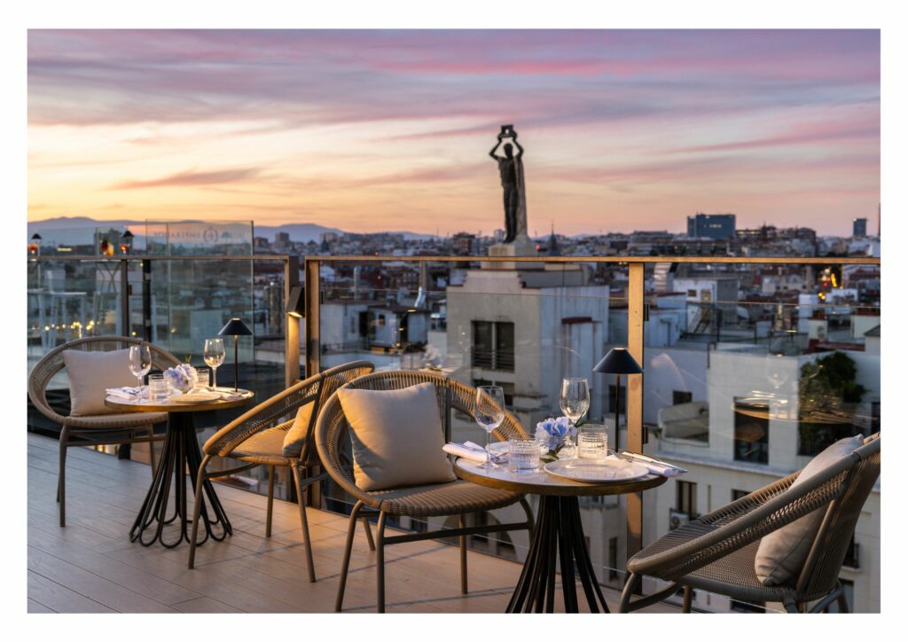Las increíbles vistas al skyline madrileño convierten al Hotel Emperador y a su espacio La Terraza, en el place to be para contemplar los mejores atardeceres de la capital y disfrutar del mejor y más animado afterwork.