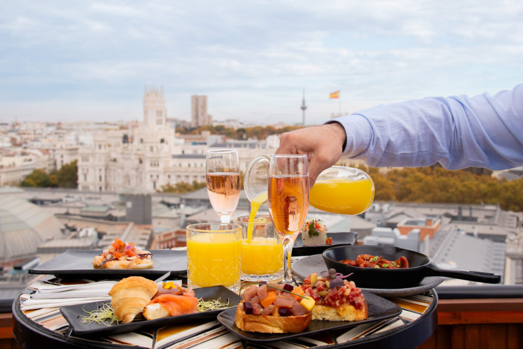 La experiencia puede acompañarse con maridaje opcional, diseñado para potenciar y equilibrar cada pase. Siempre, acompañado de las mejores vistas de Madrid en una terraza acristalada y acondicionada con calefactores en invierno.